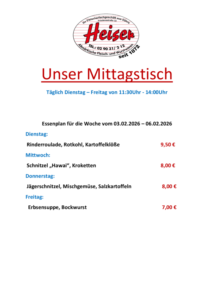 UNSER ESSENPLAN VOM 03.02.2026 – 06.02.2026von shop@fleischerei-heiser.de29. Januar 202629. Januar 2026